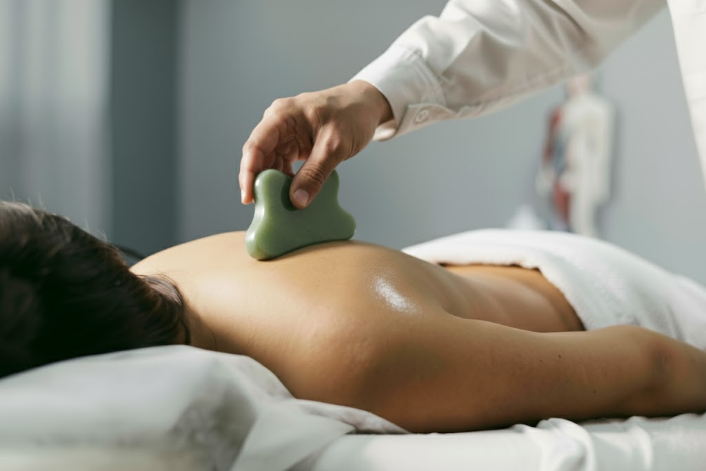 El Gua Sha se realiza con una piedra natural que se desliza y presiona suavemente sobre la piel, movilizando la circulación y liberando bloqueos acumulados.